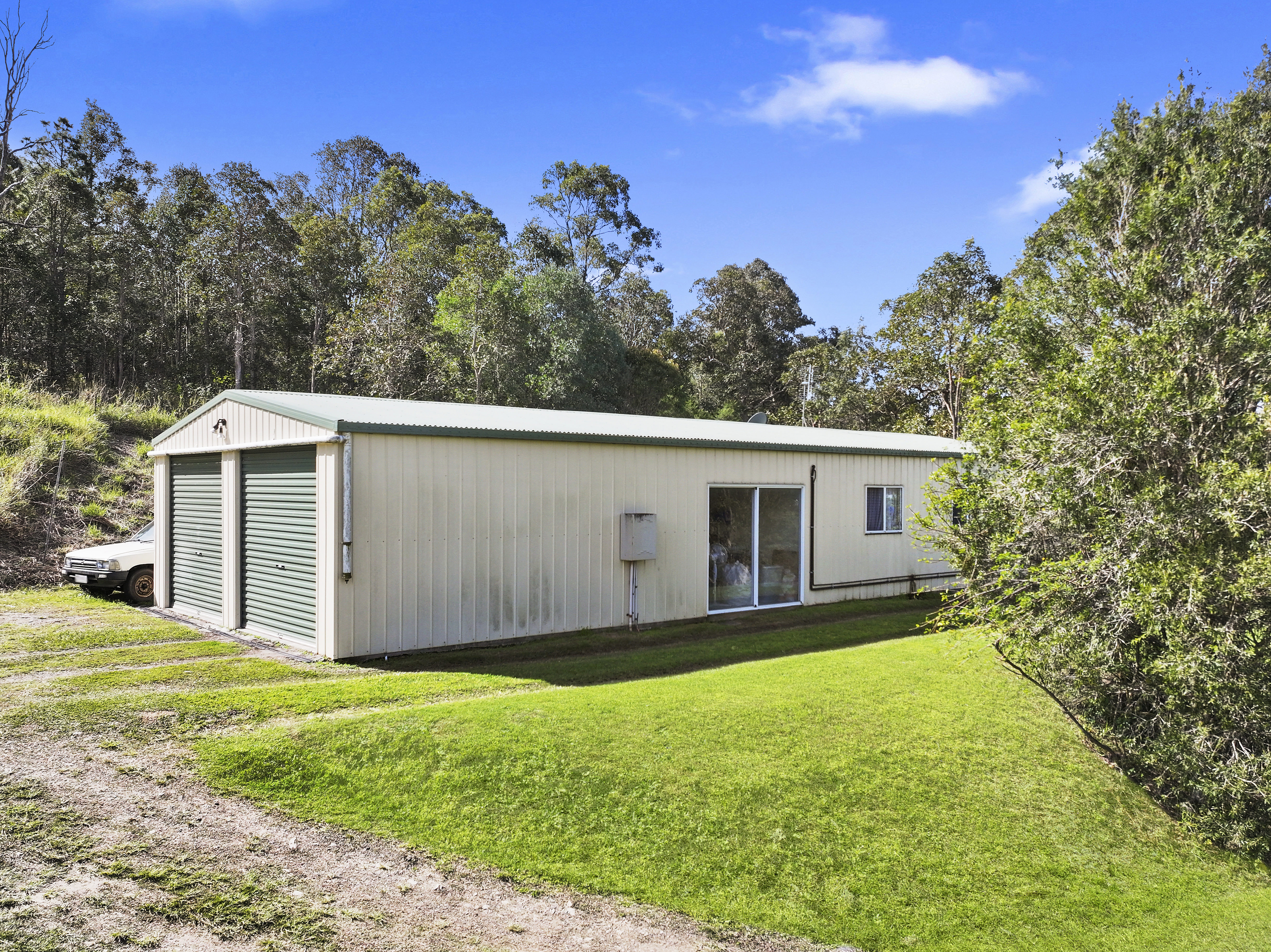 Shed details • 7x9m workshop/ garage with automatic roller doors, glass sliding door at side • extensive power and lighting • other rooms include a kitchen/ living/ dining, bathroom, laundry, bedroom /office • ceiling fans, LED lights and split system a/c • instantaneous gas hot water • water tank • local meter for power • shared HSTP